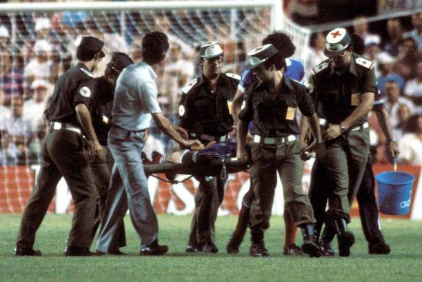 22h13 : les Français donnent raison à Hidalgo. Le ballon est insaisissable pour le champion d’Europe. Battiston (qui a curieusement remplacé Genghini) reçoit dans l’espace un caviar de Michel Platini dans le dos de la charnière centrale teutone. Le ballon rebondit un peu, le défenseur lorrain tente le lobe, avant que Schumacher ne le ratatine comme un vulgaire bucheron. Quadruple peine : la balle rate de peu la cible ; Battiston, K.O technique et deux dents en moins, quitte le terrain sans connaissance sur une civière ; le gardien, comme halluciné, braille sur tout le monde alentour et ne prend pas même pas de jaune ; pire : il n’y aura même pas faute. Platini raccompagne son pote groggy sur la civière en lui tenant la main. Le « film » vient de basculer définitivement dans la quatrième dimension…