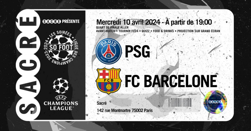 Enfin ! Après 3 échecs successifs, le Paris SG retrouve les quarts de finale de la Ligue des champions le mercredi 10 avril prochain. Et il y affrontera le FC Barcelone de Xavi. En match aller-retour bien sûr. Et on vous propose de vivre ce premier round avec la rédac de So Foot au discobar Sacré devant les 4 écrans que nous disposerons spécialement pour ce match.