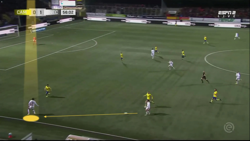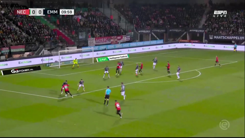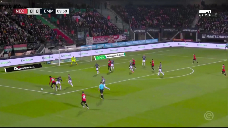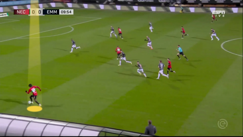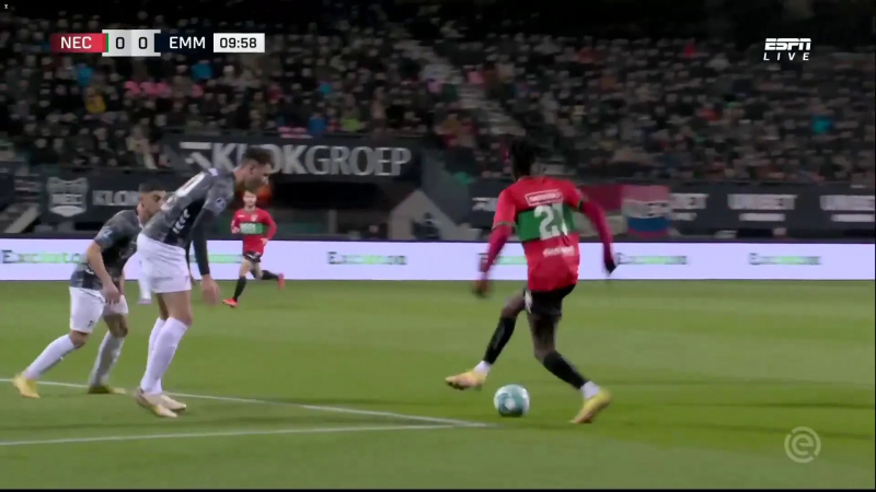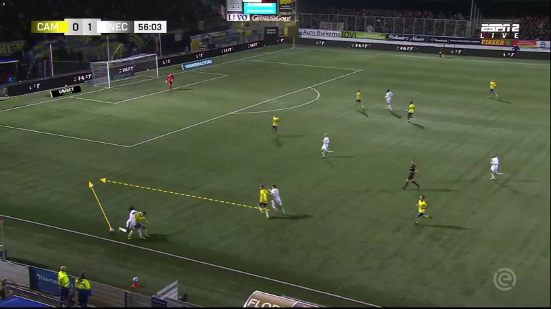 Le match du NEC contre Cambuur, début novembre, a été une belle démonstration de la complicité du duo Cissoko-El Karouani, comme sur cette situation, où le latéral marocain va trouver Cissoko le long de la ligne…