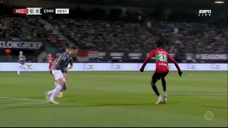 Difficile, en effet, de ne pas être curieux face à un tel profil, qui, cette saison, est vite venu se faire une place sur les hauteurs des tableaux statistiques d’Eredivisie. Ibrahim Cissoko n’y a pourtant disputé ses premières minutes qu’au printemps 2022 lors d’une défaite du NEC Nimègue à Utrecht et n’a été titularisé qu’à neuf reprises en 2022-2023. Cela lui a pourtant suffi pour se faire une petite réputation et attirer les regards des fourmis de la cellule de recrutement du Téfécé, qui ont fait de l’ailier leur deuxième recrue de l’été – la plus chère – après l’arrivée du milieu espagnol César Gelabert et avant celle d’un autre milieu, vénézuélien cette fois, nommé Cristian Casseres Junior. Mais pourquoi nourrit-il autant de curiosité ? D’abord, car comme il l’a dit lui-même, Cissoko est un joueur qui aimante naturellement le regard par son style spectaculaire, son football créatif, percutant, explosif. Dans une époque où la data aide à faire rapidement émerger les joueurs ayant un pouvoir majeur, il n’a pas tardé à se faire un nom dans le milieu du scouting en bouclant la saison d’Eredivisie dans la meute des meilleurs dribbleurs du championnat aux côtés d’Osame Sahraoui (Heerenveen), Mohammed Kudus (Ajax), Vaclav Černý (Twente), Javairô Dilrosun (Feyenoord) et Million Manhoef (Vitesse). Dans ce lot, Ibrahim Cissoko, adepte des passements de jambes par paquet de trois ou quatre, tourne à un peu plus de neuf dribbles tentés par 90 minutes, mais ressort surtout par son taux de réussite très élevé dans ce registre (plus de 67%). Une réussite que l’on peut expliquer par la grande imprévisibilité du bonhomme, qui, après avoir démarré, peut partir aussi bien pied gauche que rentrer pied droit.