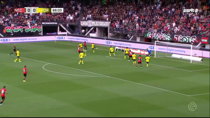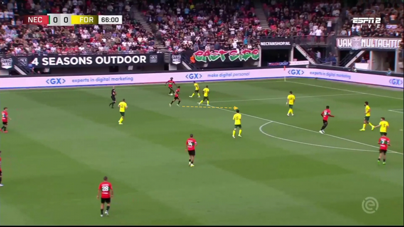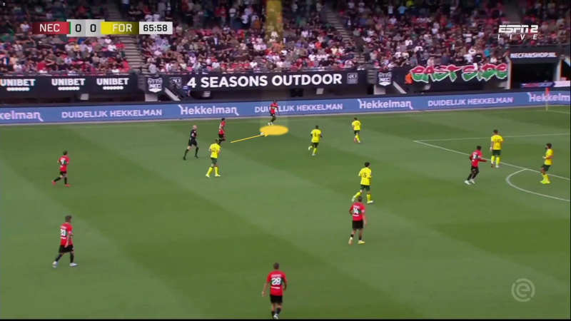 Dans ce projet de jeu, Ibrahim Cissoko, qui a laissé entrevoir quelques bonnes pistes dans l’attaque de la profondeur, devrait, sauf surprise et même s’il peut évoluer à droite, être utilisé dans un rôle d’ailier gauche pour étirer et secouer les blocs adverses. Au-delà de ce fait, c’est aussi et surtout sa complémentarité avec son latéral et le relayeur évoluant sur son côté qu’il faudra observer de près, lui qui avait réussi à développer une liaison presque télépathique avec Souffian El Karouani du côté du NEC. Cissoko passant 90% de ses rencontres collé à la ligne de touche pour s’offrir le maximum de temps pour créer – il sait aussi prendre un rôle d’ailier intérieur, et ça a été notamment le cas lors d’un match pétaradant face au RKC Waalwijk la saison dernière (6-1) –, El Karouani n’hésitait alors pas à plonger dans le couloir intérieur pour attaquer la profondeur ou pour lui servir de relais.