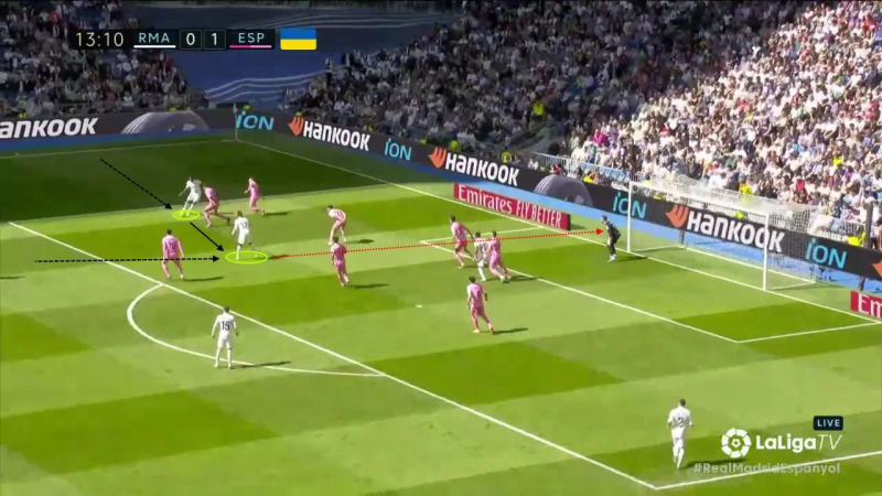 Lorsque le Brésilien se retrouve dans cette situation sur attaque placée, il peut ensuite compter sur la présence de son jeune latéral dans la surface pour combiner. Face à l’Espanyol (3-1) il y a deux semaines, Camavinga a privilégié la frappe.