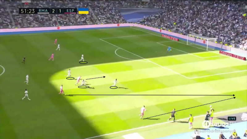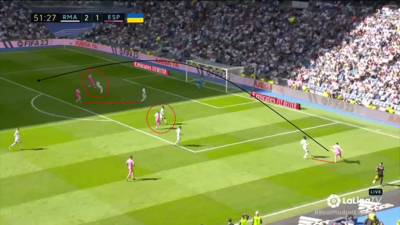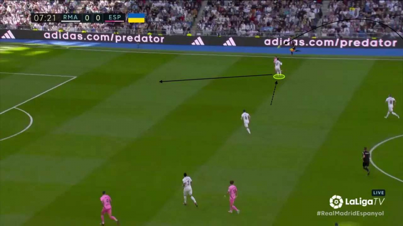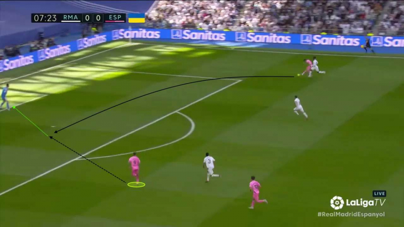 Face à l’Espanyol, Cama est à nouveau en difficulté au moment de défendre son couloir dans ces fameux 2 contre 1. Cette fois, il est bien orienté, mais beaucoup trop loin de son vis-à-vis. Il veut fermer l’appel à l’intérieur, mais Nacho, Tchouaméni et Militão peuvent couvrir…