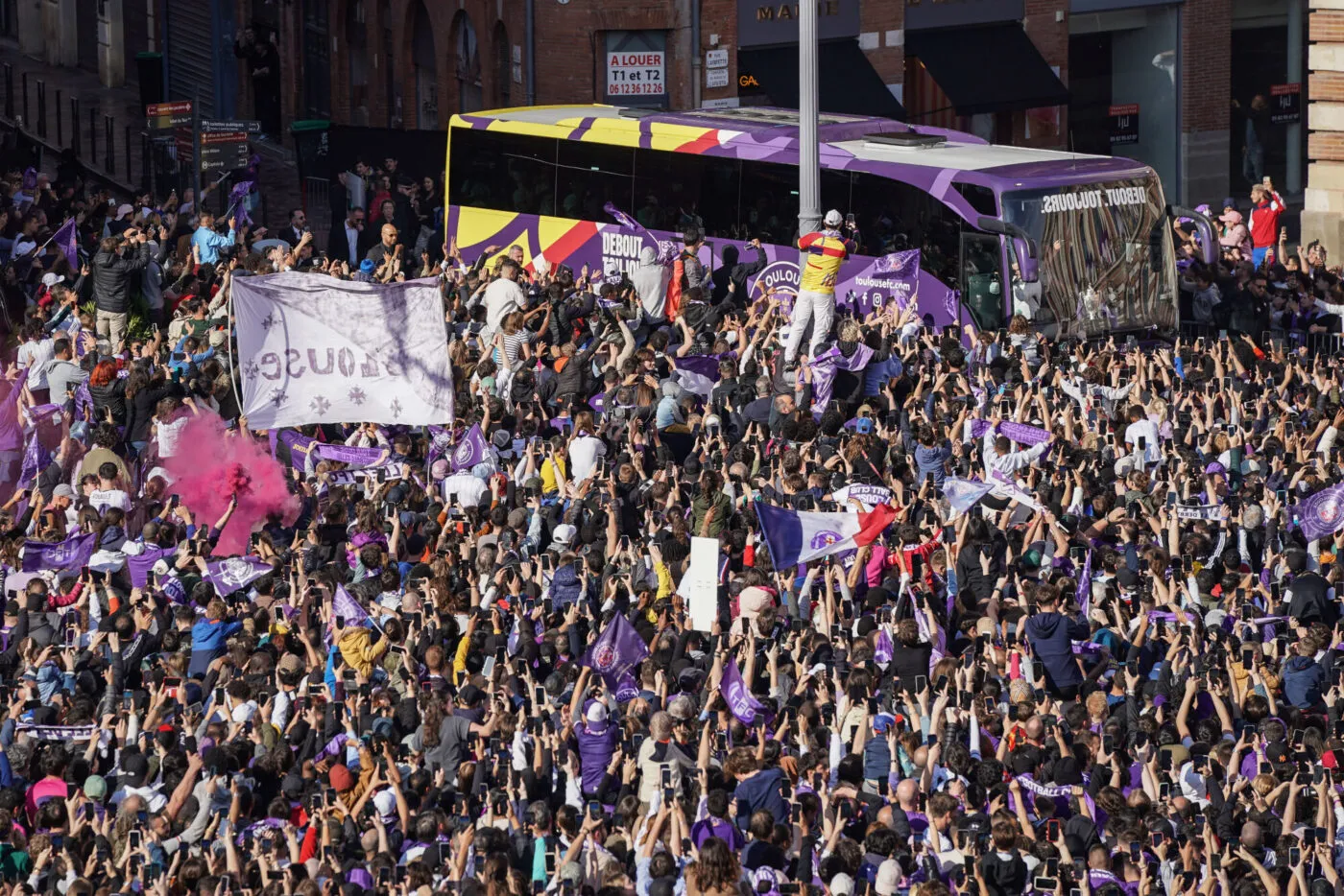 Un sentiment nouveau pour des Toulousains qui n’avaient jamais connu une telle passion autour du club. En effet, depuis la reprise du club en 2020 par le fonds d’investissement américain Redbird, le scepticisme initial a vite disparu grâce au projet proposé par le président Comolli et mis en place par le coach Montanier sur le terrain depuis deux ans. En parallèle, dans les tribunes, le changement saute aux yeux, et le Stadium ne sonne plus creux. À Toulouse, il y a toujours eu un amour du foot, mais pas vraiment une culture du « supporterisme ». Les meilleures saisons, il y avait environ 8000 abonnés, à l’époque Elmander, mais cette année, ils sont plus de 13 000, avec une moyenne de 23 000 supporters à domicile. « Debout. Toujours. » Le slogan du club présent sur le bus violet, arrivé vers 18h30, prend tout son sens pour la foule patiente et passionnée qui voit enfin le soleil percer les nuages. Reçus par le maire Jean-Luc Moudenc et Laurence Arribagé, adjointe en charge des sports, mais aussi femme de l’ancien capitaine et entraîneur du club Dominique Arribagé, les joueurs n’ont peut-être pas encore totalement conscience d’avoir marqué l’histoire du club. Contrairement à leur président, ému lors de son discours. Tout comme Younès dans la première rangée contre les grilles face au balcon : « On rentre dans une autre catégorie depuis hier soir : celle des gagnants ! L’an dernier, nous étions là pour le titre de Ligue 2, même si un peu moins nombreux quand même. Aujourd’hui, c’est différent : c’est la coupe de France au Capitole ! Ta vie de supporter change avec cette victoire, tu es reconnu avec ce titre aux yeux de toute la France ! »