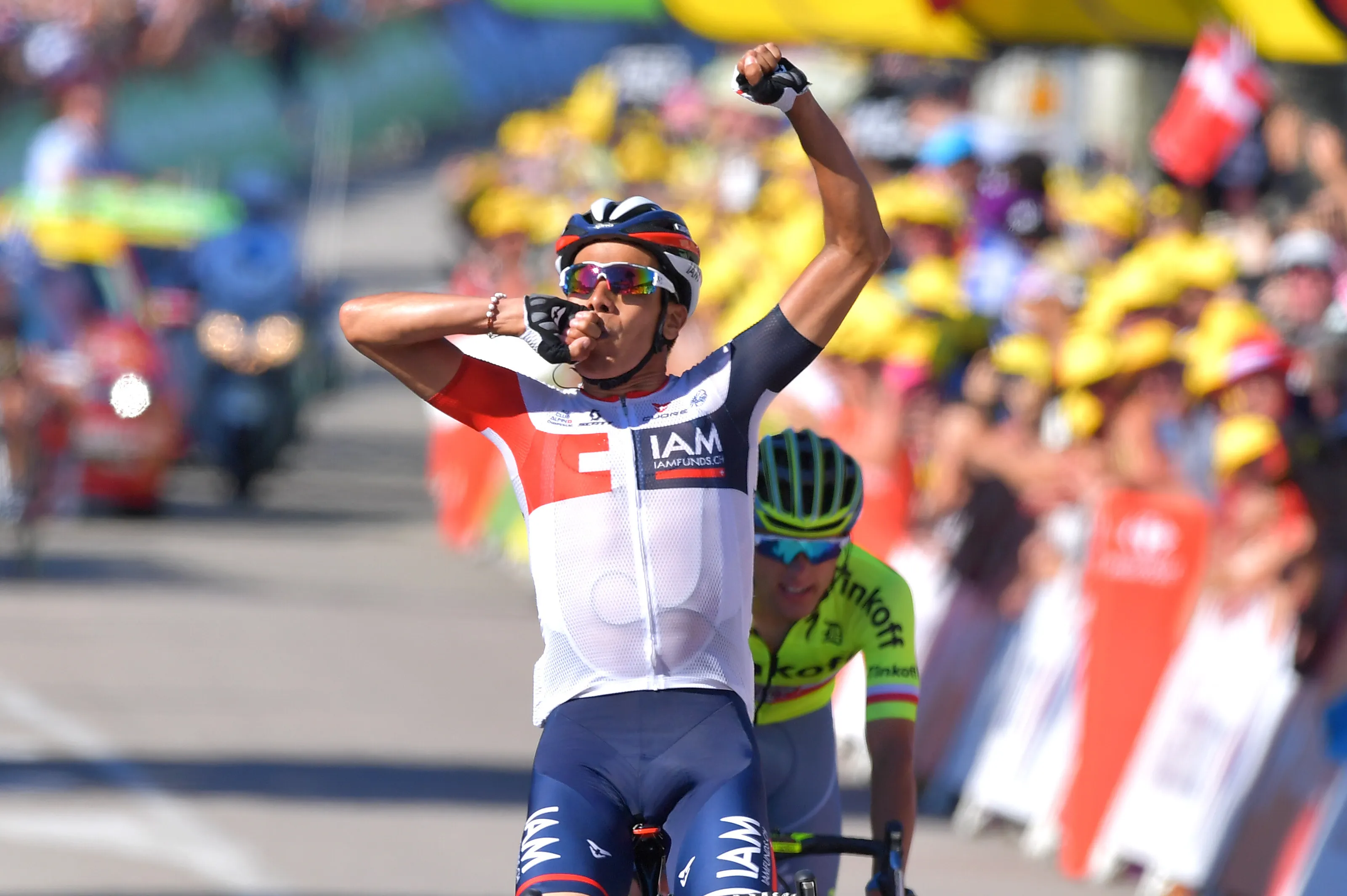 Jarlinson Pantano, c’était pour l’instant une image insolite : celle du Colombien de 27 ans franchissant la ligne d’arrivée un parapluie à la main, sous le déluge de fin d’étape à Andorre-Arcalis. Jarlinson Pantano, ce sera à présent des images ébouriffantes en descente avant un sprint victorieux qui vaut au coureur de IAM la première victoire de sa carrière sur un grand Tour.
