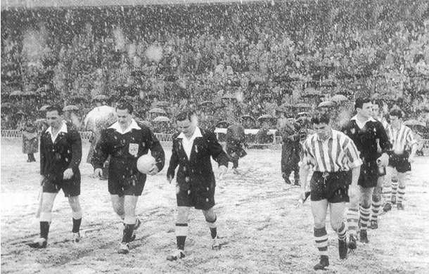 Pour le premier quart de finale de son histoire, l’Athletic Bilbao doit se coltiner un monstre : Manchester United. Plus que leur légendaire coach, Matt Busby, les Red Devils affichent l’une des plus belles escouades de leur histoire. Le 16 janvier 1957, c’est un San Mamés enneigé qui accueille les 22 acteurs de ce choc. Malgré un terrain nappé de blanc et une visibilité ridicule, les Basques prennent le meilleur départ et mènent déjà 3-0 à la mi-temps. Sentant l’exploit proche, la Cathédrale pousse ses oisillons et espère contrer un retour des visiteurs. Au final, la partie se solde sur un fantastique 5-3 aux perspectives alléchantes. « Ce résultat montre que les deux équipes ont joué avec un sentiment commun de ce que doit être un football meilleur » , s’enflamme le chroniqueur sportif du Correo. Reste désormais le plus ardu : contenir Old Trafford. Dès leur atterrissage à Manchester, la première bonne nouvelle tombe. L’enceinte des Red Devils étant en travaux, c’est au stade de Maine Road, propriété des rivaux de City, que se décidera la rencontre. Devant 70 000 fans, l’Athletic fait bonne figure et conserve son espoir de qualification jusqu’aux ultimes instants. Le moment choisi par Berry pour crucifier son monde et offrir un succès 3-0 aux siens. En 2012, l’Athletic de Bielsa a enfin rendu la monnaie de sa pièce à United.