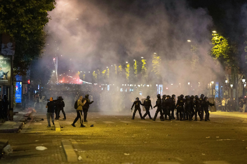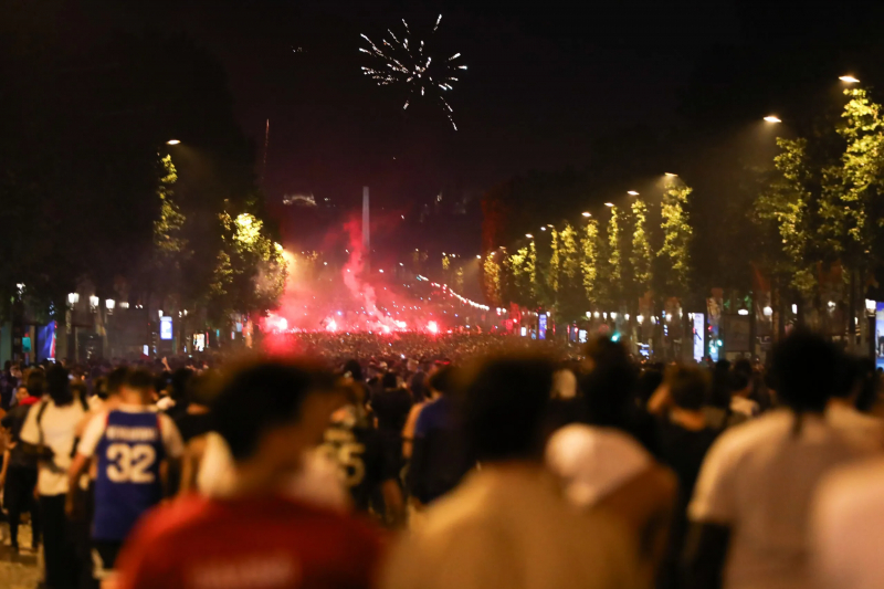 Mais, comme si c’était prévu, la fête dégénère. Les Champs-Élysées sentent soudain les gaz lacrymogènes à plein nez, le match de football se transformant en partie de ball-trap. La boutique Foot Locker est envahie, certains se promènent avec des bras ou des jambes de mannequins. Les forces de l’ordre ne laissent passer sur l’avenue que les plus téméraires, qui reniflent les lacrymos et la fumée. Un couple de jeunes Polonais, en lune de miel depuis Varsovie, se demande ce qu’il fait là. Pas rassurés, les deux cherchent à quitter les lieux. La police laisse quelques passages vers les rues attenantes, celles de La Boétie, le Colisée, Marignan, Berri, Washington. Plus on monte vers l’Arc de Triomphe, plus la tension monte. Les vélos brûlent, le verre éclate et les CRS chargent. 5 400 forces de l’ordre ont été déployées dans la soirée, qui s’est éternisée jusqu’à deux heures sur l’avenue. Le lendemain matin, l’heure est au recueillement et à la peine infinie à Dax, Grenoble et Paris. Deux morts, 559 interpellations. Les questions vont pleuvoir. Les Parisiens, eux, remercient la victoire.