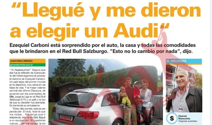 Tout comme Lamine Yamal était apparu très tôt dans les médias avec Lionel Messi, Valentín Carboni aussi a une longue histoire avec les médias. Âgé de seulement 3 mois, il apparaît sur une photo du journal Olé à l’occasion d’une entrevue du journal argentin avec son père. Une photo anodine, à côté d’une voiture. C’était donc déjà écrit.