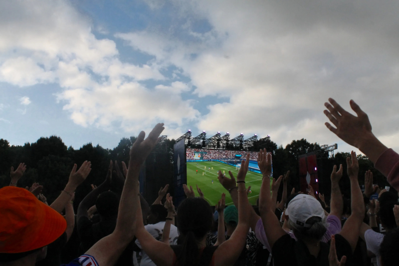 Ce vendredi en fin d’après-midi, la télé diffuse la finale du tournoi de foot masculin. Et même si « le foot, ce n’est pas vraiment les JO », comme en témoigne Camille, il faut se faufiler pour avoir une place de choix. « J’aime bien le foot à la Coupe du monde, mais aux JO, je m’en fous. Je préfère regarder d’autres sports qu’on voit moins d’habitude », analyse-t-elle. Au programme du soir, France-Espagne, une finale logique entre les deux meilleures équipes du tournoi. Ça promet du beau spectacle, de quoi se prendre une pinte à 11,5 euros pour préparer la rencontre. Le ciel est menaçant, mais des maillots de Lacazette, Benzema et même de Sochaux ou Rodez égayent le paysage. Une Marseillaise chauffe le public déjà en sueur, et tout le monde s’assoit pour admirer « la bande des Fous » de Thierry Henry.