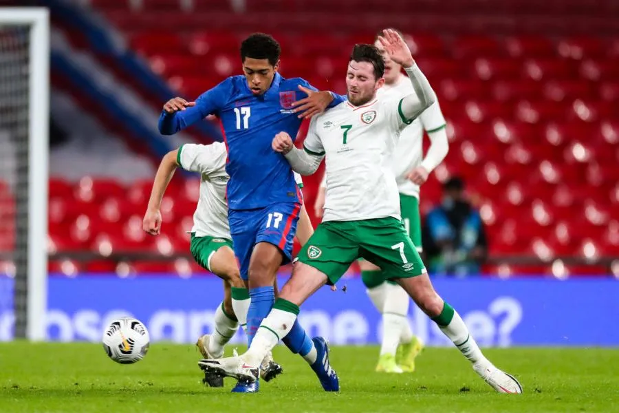 C’est, sorti des drames et à un Souleymane Diawara près, un privilège uniquement accordé aux tout grands de ce sport ou aux chantres de la fidélité. Jude Bellingham n’est encore ni l’un ni l’autre. Mais cela ne l’a pas empêché de devenir cet été l’égal de Javier Zanetti, Francesco Totti, Paolo Maldini, Johan Cruyff ou Romain Danzé. Comment ? En voyant, à tout juste 17 ans, son numéro de maillot retiré de la circulation par son ex-club de Birmingham City à son départ pour le Borussia Dortmund. D’autant plus fort que le foot anglais n’est vraiment pas coutumier du fait. La preuve, s’il en fallait encore une, que l’ado est à ranger dans la catégorie « espèce rare » . Nouvelle illustration près de quatre mois après les faits, ce jeudi à Wembley : en entrant en jeu à la 73e minute d’un Angleterre-Irlande déjà plié, Bellingham est devenu à dix-sept ans, quatre mois et quatorze jours le troisième plus jeune joueur à revêtir la liquette des Three Lions. Les deux premiers ? Theo Walcott, et Wayne Rooney. Deux noms qui incitent respectivement à la prudence, et à l’optimisme. Mais pour l’heure, c’est bien l’optimisme qui prime au royaume de Sa Majesté.