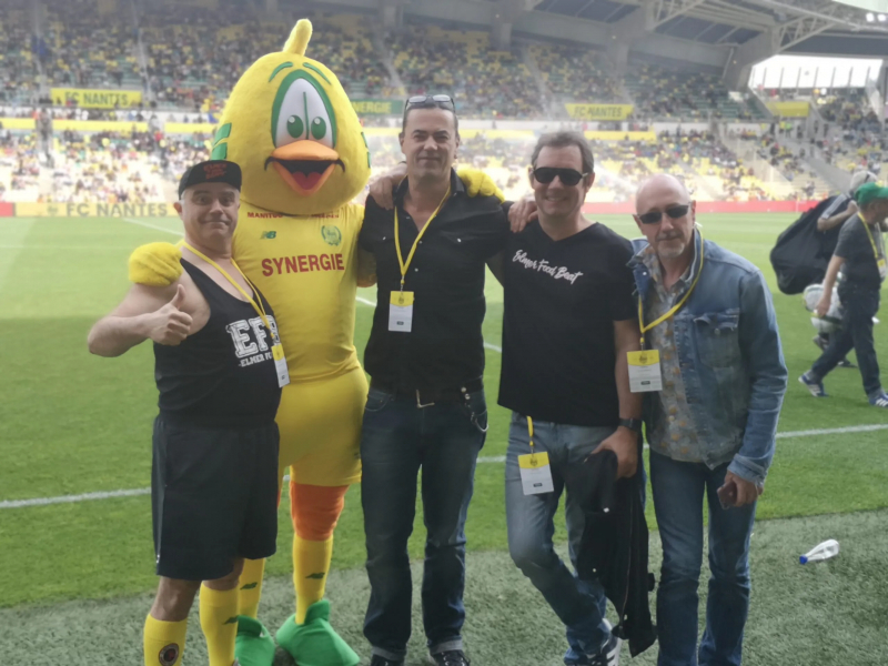 « Quand nous étions des petites vedettes à Nantes, le président offrait un panier garni aux visiteurs. Forcément, il y avait du muscadet, des BN, des LU, des berlingots, des produits typiquement nantais… et un disque d’Elmer. Ça nous a introduits à la Beaujoire par la grande porte. On a même fait un hymne, qui s’appelle “Du rififi dans la surface”, qui a fait une petite entrée à la Beaujoire et n’a duré que deux ans. Notre éditeur voulait qu’on affiche nos couleurs, comme Oasis avec Manchester City. Mais le texte était ancré dans une époque très précise, ça ne peut pas durer dans le temps. On a joué deux fois sur la pelouse. Une fois dans le rond central, à la mi-temps d’un match. C’était impressionnant car le stade était plein, c’est une drôle de sensation. C’était assez magique de se retrouver là. Et puis une deuxième fois, devant la tribune des supporters, entre le but est et la tribune. On était plus proche des gens. »