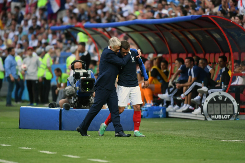 Il est arrivé dans le tableau habillé en ailier fragile, début mars 2014, au Stade de France, les bras maigres et la tête encore en construction. Puis, Antoine Griezmann, dévasté au début de l’été suivant après être tombé d’un quart face à l’Allemagne, où on garde tous précieusement en tête une photo de lui sur la pelouse du Maracanã, consolé par les bras de Rio Mavuba et Eliaquim Mangala, est devenu un projet. Un projet fascinant à voir évoluer au fil des années, qu’il a fallu apprendre à savoir regarder, choyer, pour mieux en profiter. Il y a ici l’idée d’un fait qui a très vite été établi par l’ensemble des suiveurs : avec Griezmann, la France du foot a eu un incroyable talent, rare, générationnel. Un mec à ranger sur l’étagère de Platini et de Zidane, héros de toute une époque, aux côtés de Hugo Lloris, Raphaël Varane, Paul Pogba et Olivier Giroud, et même de toute une campagne russe. En 2018, le Mâconnais aura été l’âme de fond d’une équipe tournée autour de ses pieds et de ses poumons, le jeune ailier étant devenu, sous le regard de Diego Simeone, un pilote précis dans les transitions et un chasseur affamé. Bref, un équilibriste que Didier Deschamps aura utilisé plus qu’aucun autre joueur (137 matchs, dont 84 matchs des Bleus consécutifs) et avec qui le sélectionneur aura tissé au fil des années un lien fait d’un matériau spécial.