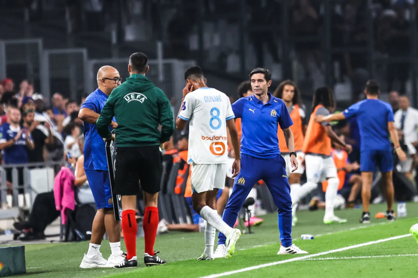 L’OM tenait sa qualification et avait le match bien en main. La différence s’est, certes, faite sur plusieurs coups du sort (le penalty concédé dans le temps additionnel, le but de Vitinha refusé pendant la prolongation), mais l’arbitrage et la poisse ne peuvent être tenus pour uniques responsables de la désillusion olympienne. Les choix de Marcelino aux instants clés de la partie ont changé – dans le mauvais sens – le match de l’OM, quand ceux de son homologue Ivan Jovanovic ont eux été salutaires, avec l’apparition de Bernard qui, comme une semaine plus tôt, a redonné vie à une équipe jusque-là timorée. Ainsi, à l’approche de la fin du temps réglementaire, alors que l’OM menait toujours 2-0 mais se devait de pousser pour inscrire un troisième but et se donner un matelas, le coach asturien a décidé de dégager son attaquant Pierre-Emerick Aubameyang, auteur des deux buts olympiens. Une sortie que l’on peut qualifier de prématurée, malgré la bonne entrée de Vitinha.