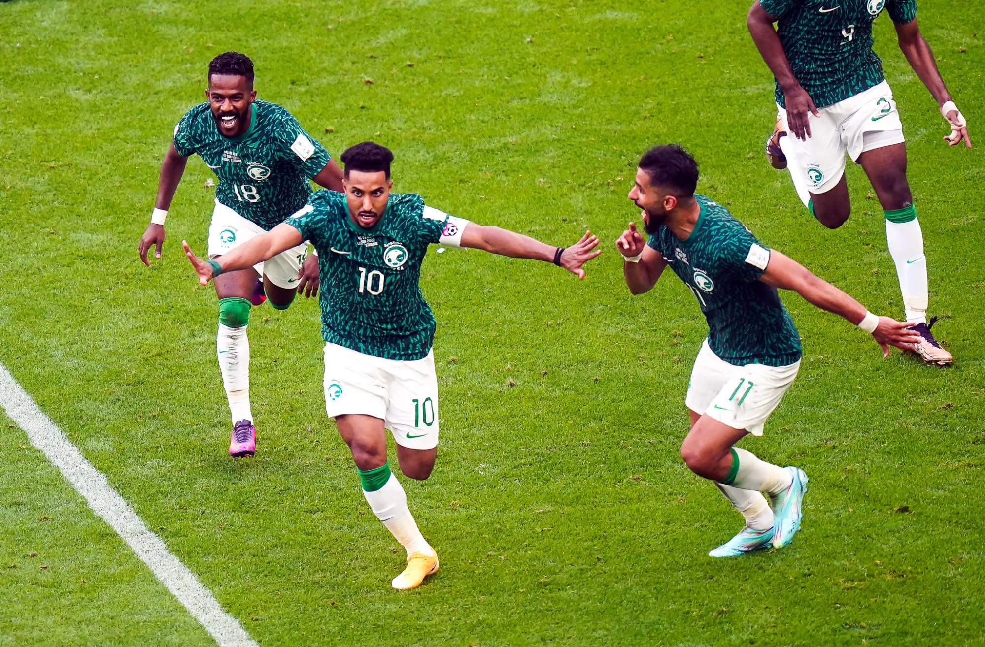 Alors que les Saoudiens auraient pu être menés de deux ou trois buts à la pause, la faute à un piège du hors-jeu manié parfois jusqu’à l’automutilation, Saleh Al-Shehri parvient à se frayer un chemin devant un Cristian Romero dérouté, avant de croiser son tir au devant de « Dibu » Martínez. Sur la vague, comme transcendés par l’événement, les Faucons laissent ensuite libre cours à la magie. Excentré côté gauche, Al-Dawsari part en dribble derrière sa jambe d’appui, sort sa meilleure feinte de corps et se remet sur son bon pied – le droit -, avant de laisser sa carte de visite à Rodrigo de Paul et Leandro Paredes, le double pivot symbole d’une Albiceleste retombée dans ses travers. Un golazo de sniper, pour faire le tour de la planète, qui explicite la résilience d’une équipe en tout point fidèle à ses principes offensifs et bagarreurs. En bon facteur X, le polyvalent ailier gauche s’était déjà signalé pour crucifier l’Égypte au Mondial 2018 (et lui piquer la troisième place du groupe A), sur une demi-volée dans un angle très fermé, au bout du bout du temps additionnel. Désormais, c’est aussi – et seulement – le troisième joueur saoudien à avoir marqué plus d’un but en Coupe du monde, en compagnie de la légende Sami Al-Jaber et de Fuad Amin.
