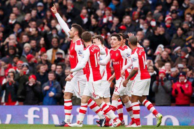 O. Giroud (8′), M. Özil (55′), T. Walcott (63′), Santi Cazorla (75′), H. Bellerín (92′) pour Arsenal