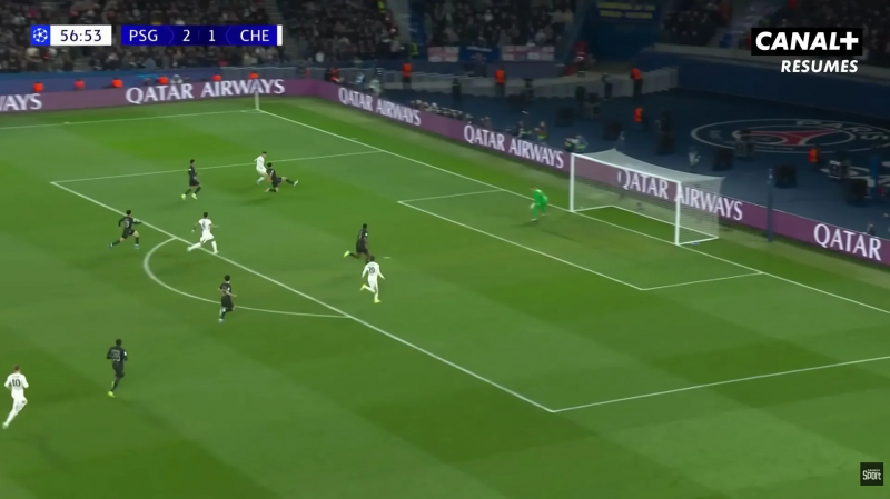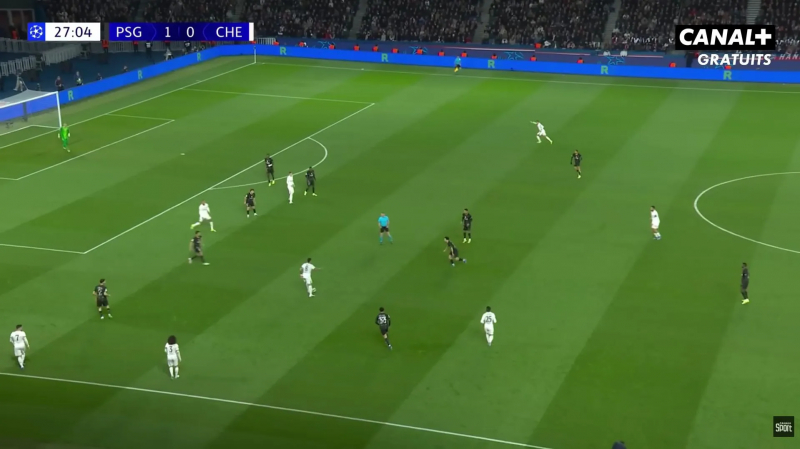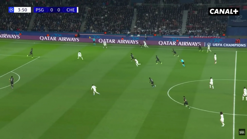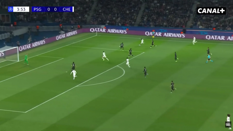 4e minute de jeu au Parc et João Neves perd un ballon le long de la ligne de touche. À la récupération, les Parisiens, qui se sont déjà projetés, sont dépassés par le ballon, et Chelsea est en surnombre.
