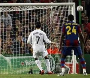 En face, Manchester évolue en blanc, c’est nul et en 442, comme au bon vieux temps. Sir Alex choisi de dégarnir un peu son milieu et d’aligner Park, Tevez, Ronaldo et Rooney. La disposition est curieuse. Rooney joue ailier droit, Park gauche, Tevez en pointe et Ronaldo partout où il reste de la place. Il a d’ailleurs via ce match au sommet l’occasion de confirmer tout ce qu’on pense de lui, en bien ou en mal, danseuse étoile ou rat d’opéra. Un coup-franc, un corner, une tête et une main de Milito plus tard, le voilà jambes écartées s’apprêtant à frapper son pénalty.