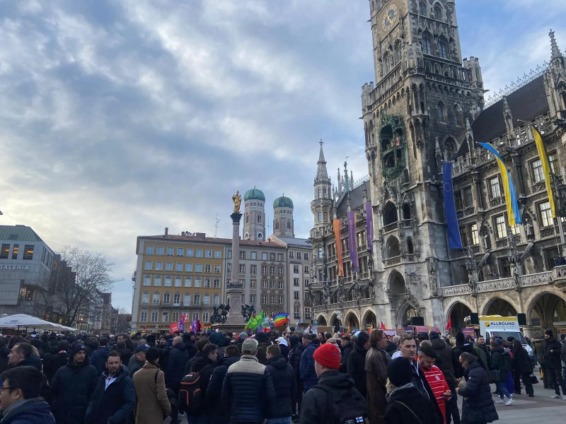 Après plusieurs arrêts pour se dégourdir les jambes et manger un morceau dans les aires d’autoroute, tous arrivent au Bayerischer, hôtel munichois situé à quelques mètres de la célèbre place Marienplatz aux alentours de 16 heures, une heure avant la deadline pour récupérer les tickets pour le match du soir. Devant, la queue est énorme, la tension se fait déjà bien ressentir, et certains fans du PSG – les plus courageux – sortent les mains des poches pour sortir un drapeau ou une écharpe aux couleurs du club. Très vite, les supporters parisiens se rassemblent sur la Marienplatz pour lancer le cortège et se rendre à l’Allianz Arena, à une petite demi-heure de métro de là. Très vite, les valeureux supporters vont se rendre compte que la police les empêche de se réunir. La raison : les forces de l’ordre sont déjà occupées à canaliser les quasiment 2000 Munichois venus devant l’hôtel de ville manifester leur solidarité au peuple ukrainien et demander au gouvernement allemand de les aider davantage. Bref, l’ambiance est très étrange au pied de cette tour, et devient presque angoissante à 17 heures, quand les figures du carillon mécanique se mettent à s’animer. Les peu de chants parisiens disparaissent, la colère des manifestants ne se fait plus du tout entendre, et tout le monde lève la tête pour voir les personnages bouger et sonner. « Honnêtement, je ne sais pas ce qu’on attend. Il est prévu qu’on se retrouve tous, les 3200 qui ont fait le déplacement, devant le stade. Autant y aller maintenant », clame un des supporters, lui aussi venu en covoiturage. 18 heures passées, tout le monde embarque dans les métros munichois pour se rendre au stade.