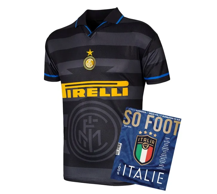 Álvaro Recoba, Diego Simeone, Taribo West, Youri Djorkaeff, Ivan Zamorano et surtout Ronaldo. Cette saison-là est mythique à plus d’un titre pour l’Inter, qui malgré sa deuxième place finale derrière la Juve, verra son attaquant brésilien terminer meilleur buteur de Serie A avec 25 buts, empocher un Ballon d’or pour sa fin de saison avec le Barça et son début avec les Nerazzurri, mais surtout soulever une nouvelle Coupe de l’UEFA face à la Lazio (et des victoires face à Lyon, Strasbourg, Schalke 04 et le Spartak Moscou aux tours précédents). Avec ce maillot, nous vous proposons un hors-série So Foot 100% Italie avec dedans Baggio, Lippi, Del Piero, Rivera, Sacchi, Mazzola, Cannavaro, Chinaglia, Totti, Inzaghi, Chiellini, Buffon, Berlusconi, Materazzi, De Rossi, Zola, Mancini, et même… Fabrice Drouelle.