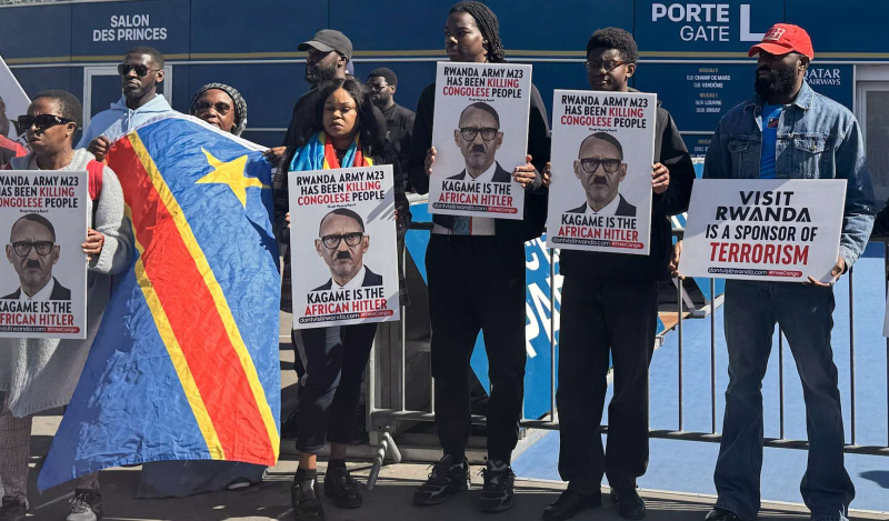 Alors que Paris est traversé par les fans de Marine Le Pen — fraîchement condamnée dans l’affaire des assistants parlementaires des députés européens — pendant que la gauche s’offre sa manif dominicale, le Parc des Princes, lui, déroule une tout autre scène. Le PSG y a célébré la veille le 13e titre de champion de France de son histoire et, ce dimanche, un grand soleil d’avril brille comme une promesse d’été. Mais Jordan Madiande, 32 ans, ne sourit pas. Planté face aux loges, il manifeste, pancarte à la main, drapeau de la République démocratique du Congo sur les épaules. En ligne de mire : le partenariat entre son club de cœur, le PSG, et Visit Rwanda, l’office de tourisme du régime de Paul Kagame. Sur les maillots d’entraînement du PSG, sur les manches d’Arsenal ou les panneaux d’affichage du Bayern, le logo s’affiche avec le même storytelling lissé : gorilles majestueux, collines luxuriantes et évasion garantie.