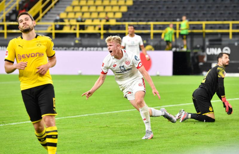 Coup d’arrêt, pour Dortmund. Dans son Westfalenstadion, le Borussia s’est fait surprendre par une équipe de Mayence audacieuse (0-2), emmenée par Jean-Philippe Mateta. Les Nullfünfer commencent la partie en posant un bloc bas afin de contrarier Jadon Sancho et compagnie. Une stratégie payante en première période : sur un contre bien construit, Mateta décale habilement Bote Baku, dont le centre est coupé d’une tête décroisée par le jeune Jonathan Burkardt (0-1, 33e). Un premier pion chez les grands pour l’attaquant de 19 ans et une première grimace sur le visage de Lucien Favre sur le banc. Et cela ne s’arrange pas au retour des vestiaires : Mateta, encore lui, transforme en force un penalty causé par une faute grossière de Łukasz Piszczek dans la surface (0-2, 49e). Jamais inspiré offensivement, le BvB passe même tout près d’une dernière correction sur une praline de Jean-Paul Boëtius. Un succès comme une délivrance pour Mayence, qui prend désormais cinq longueurs d’avance sur la zone rouge. Pour Dortmund, c’est un avertissement avant le déplacement sur la pelouse du RB Leipzig pour un match décisif pour la place de dauphin. Rendez-vous samedi, les artistes.