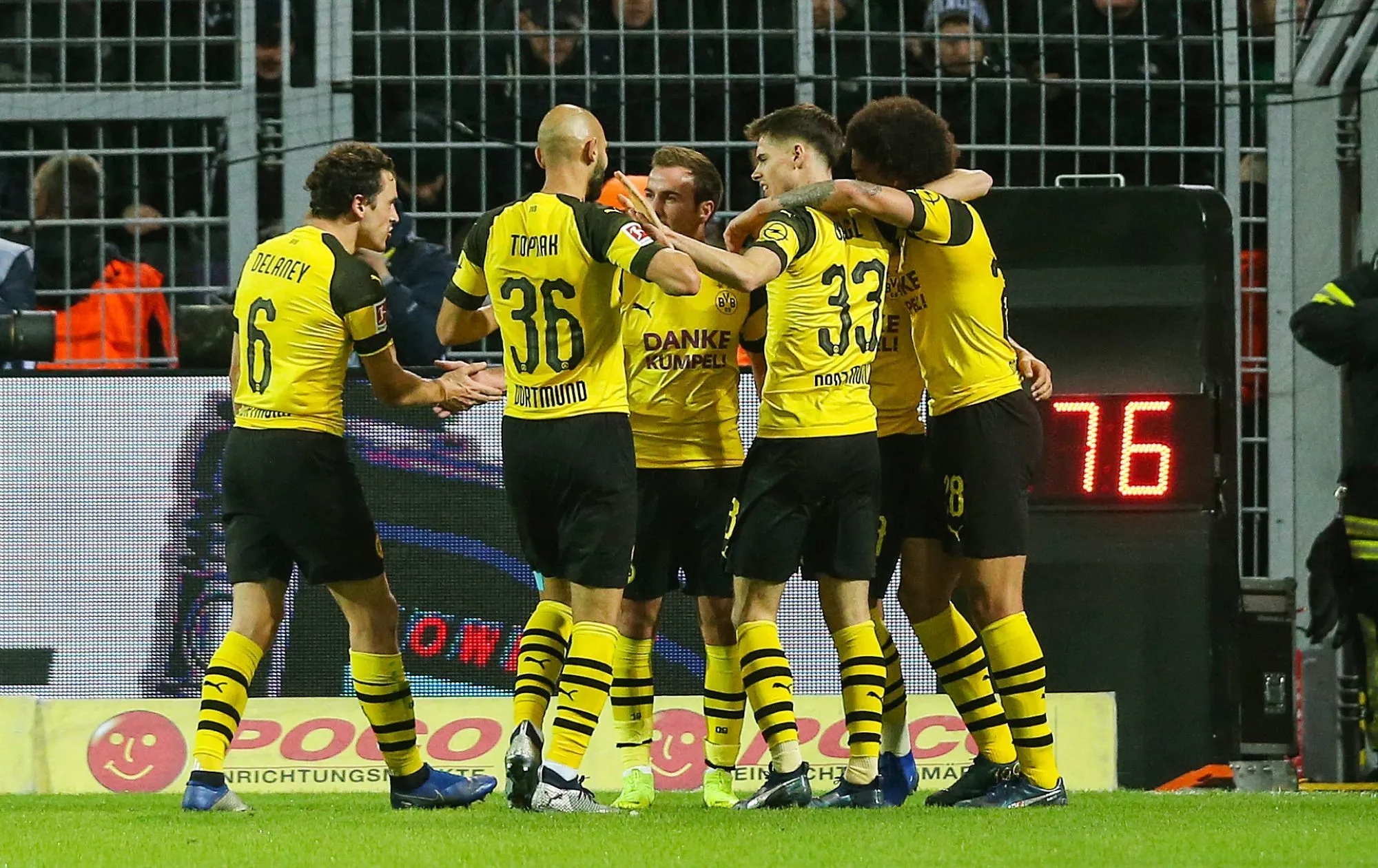 Borussia Dortmund (4-3-3) : Bürki – Hakimi, Piszczek, Toprak, Guerreiro (Larsen, 93e) – Witsel, Delaney, Weigl – Sancho (Wolf, 92e), Alcácer (Götze, 34e), Reus. Entraîneur : Favre.