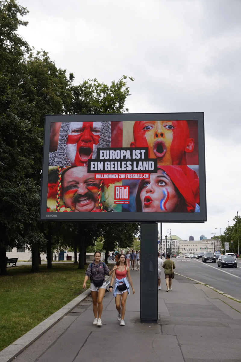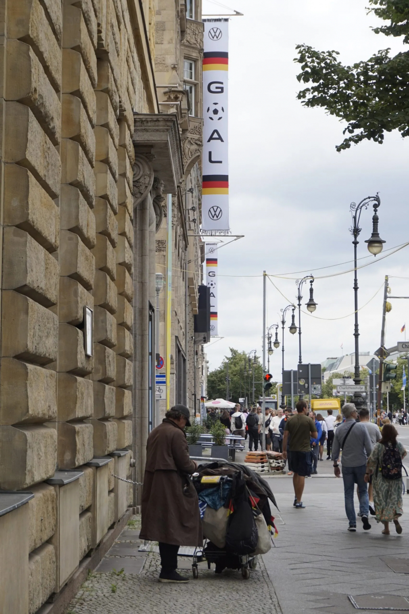 « ET N’OUBLIEZ PAS ! PEU IMPORTE L’ESPAGNE OU L’ANGLETERRE, CELUI QUI A DÉJÀ GAGNÉ LA FINALE, C’EST JESUS-CHRIST, NOTRE SAUVEUR ! TOUS AVEC MOI : NOTRE PÈRE, QUI ES AUX CIEUX… » Sous le regard interloqué des touristes venus photographier la porte de Brandebourg, une poignée de femmes vaguement illuminées font du prosélytisme en tentant d’alpaguer une foule qui n’a pas vraiment les nerfs à les écouter, à l’image de cet Anglais qui interrompt sans vergogne le Pater Noster pour brailler It’s Coming Home. On est à la veille de la finale de l’Euro 2024, point d’orgue d’un tournoi qui placera Berlin au centre des regards. Mais dans le centre de la capitale, il flotte une atmosphère de week-end estival on ne peut plus banal. Sous le ciel gris de l’Alexanderplatz, hormis le portrait de Florian Wirtz qui s’affiche sur la façade d’une galerie marchande, l’Euro semble déjà terminé et les badauds font ce qu’on fait d’ordinaire par un week-end on ne peut plus banal sur l’Alexanderplatz : du shopping, bouffer au fast-food, boire un verre trop cher sur une terrasse pour touristes et faire un grand pas de côté pour échapper aux représentants d’associations venus gratter des sous pour sauver les ours polaires de la fonte des glaces.