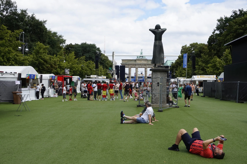 De fait, dans la Fanmeile (la « fanzone » en bon allemand) de la porte de Brandebourg, les maillots anglais et espagnols commencent déjà à se faire remarquer sur les 24 000 mètres carrés de gazon synthétique qui seront découpés dès le lendemain de la finale, puis redépliés sur les divers terrains urbains de la ville. Pour ce qui est de l’immense cage de but en métal (23 mètres de haut, 64 de large et un poids de 40 tonnes), son avenir est incertain. Alors qu’elle devait être tout simplement détruite, l’aciérie du Land de Saxe-Anhalt à l’origine de sa construction l’a mise en vente sur l’équivalent allemand du Bon Coin pour 180 000 euros. Avis aux amateurs ! En attendant, elle attire encore quelques touristes et locaux qui profitent du week-end pour s’y promener, taper un foot ou une petite sieste. Les échoppes de nourriture et de boissons sont ouvertes, mais n’attirent pas les foules. Peut-être à cause des prix pratiqués (six euros la pinte, auxquels s’ajoutent trois euros pour la caution du verre, une douzaine d’euros pour un snack mexicain, italien, indien, voire népalais) ?