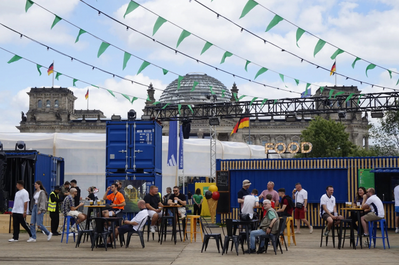 Malgré tout, les maillots allemands n’ont pas tous été déjà remisés au placard. « En même temps, j’ai payé le mien 120 balles, donc je compte bien le porter le plus de temps possible ! », se marre Chris, liquette de la DFB floquée Füllkrug sur les épaules. Son fils Lukas s’affiche quant à lui avec le nom de Jamal Musiala dans le dos. Malgré la déception, ils profitent des derniers jours de l’Euro pour parader avec les couleurs nationales, comme ces Danois et ces Autrichiens aperçus dans l’autre fanzone de Berlin, au pied du Reichstag, le Parlement allemand. « Finalement, on s’en fout de ne pas jouer la finale, c’est la fête du foot, tout le monde représente son pays et profite de l’ambiance pour faire encore un peu la fête », décrit Mathias, un Viennois expatrié à Berlin. Si les Anglais et les Espagnols font monter la température, les autres visiteurs trouvent leur bonheur en se prélassant sur un transat au son des DJ sets successifs, entrecoupés de performances artistiques dans le cadre du Fussballkultursommer, l’été de la culture foot. Sur la pelouse du Reichstag, on peut en effet faire la connaissance de plusieurs projets socioculturels en lien avec le foot et initiés par diverses associations berlinoises, mais aussi faire le plein de goodies via les stands des différents partenaires de l’Euro.