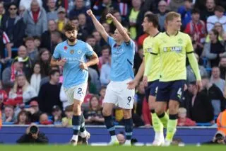 Perte de balle sans conséquence de van Dijk au dépit d'Haaland, puisqu'Alvarez ne règle pas la mire.