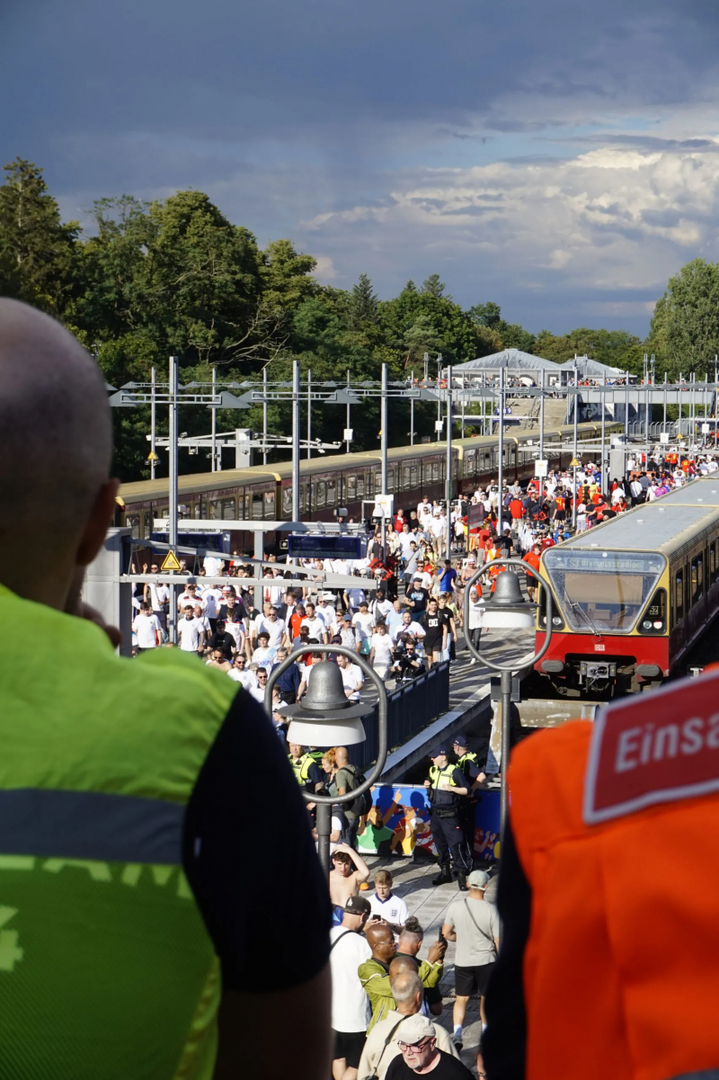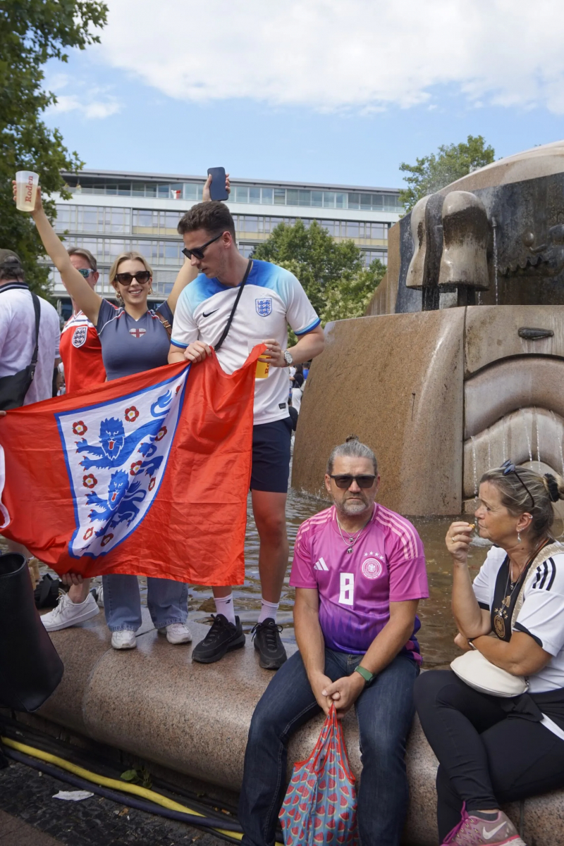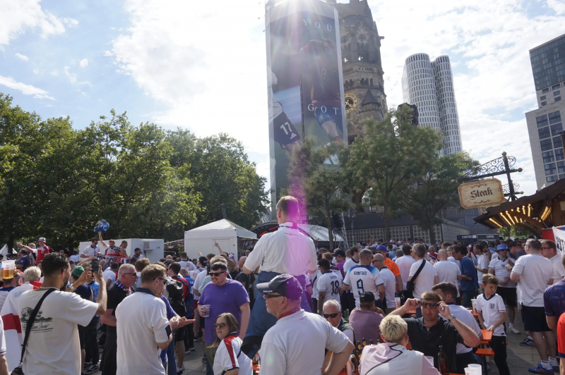 Sur la Breitscheidplatz, au pied de l’église du Souvenir de Berlin, les Anglais sont comme à la maison. Les drapeaux indiquent qu’ils sont venus de Harrogate, de Manchester, de Southend ou encore de Sunderland. Celui de Sheffield, trempé d’une malodorante flaque de vomi, rappelle que le programme suit son cours comme prévu : boire, boire, boire et chanter à tue-tête Sweet Caroline, Dancing in the Dark et Hey Jude. Le légendaire It’s Coming Home se fait quant à lui plus discret. « C’est fait exprès, justifie Mark, venu de Stoke. Avec les années, on a compris que ça nous portait la poisse de le chanter autant, c’est pour ça qu’on attend d’avoir gagné cette fois-ci. » Aussi prudent que présomptueux, le lad retourne vite attaquer une dix-septième bière en beuglant un simple « EN-GER-LAND ! » avec ses potes. L’esprit est rustre, mais bon enfant.