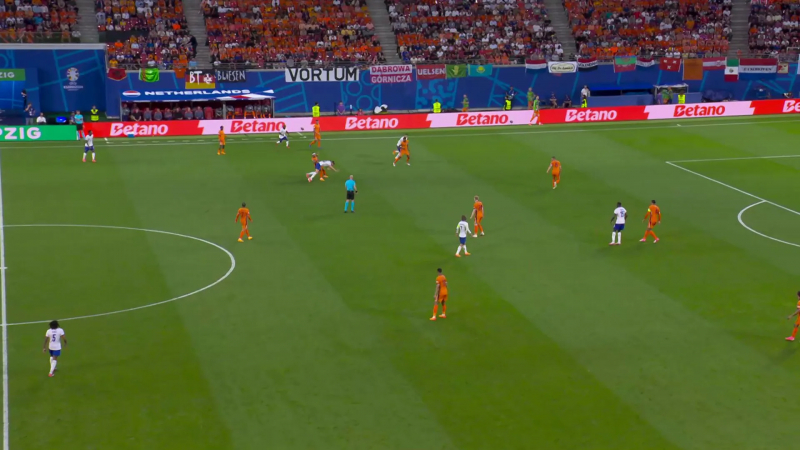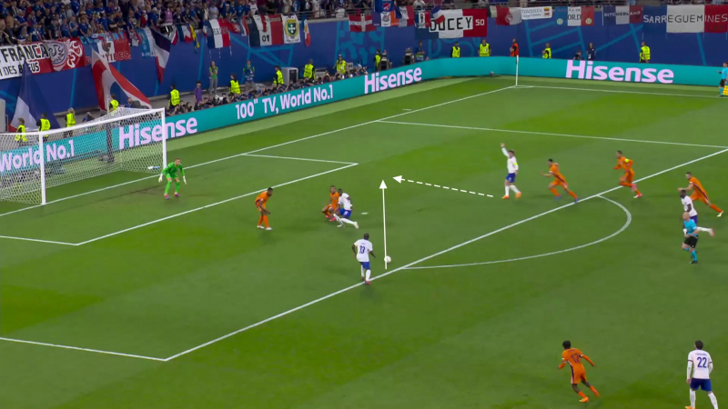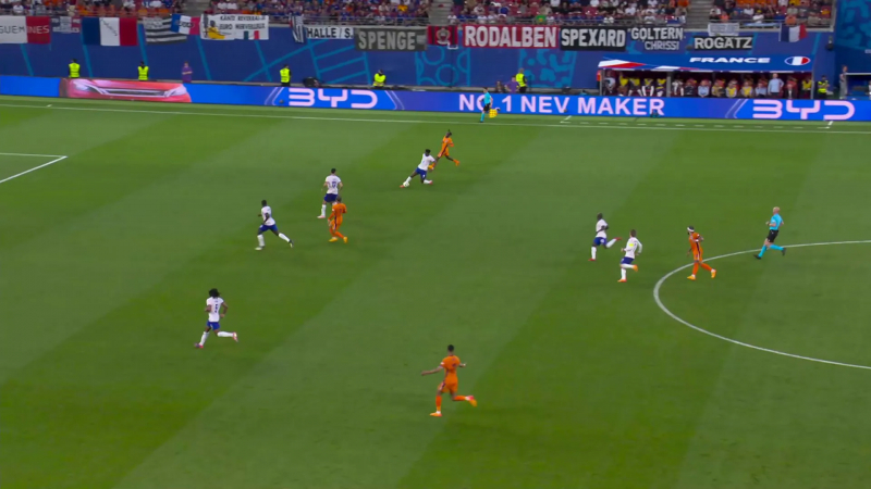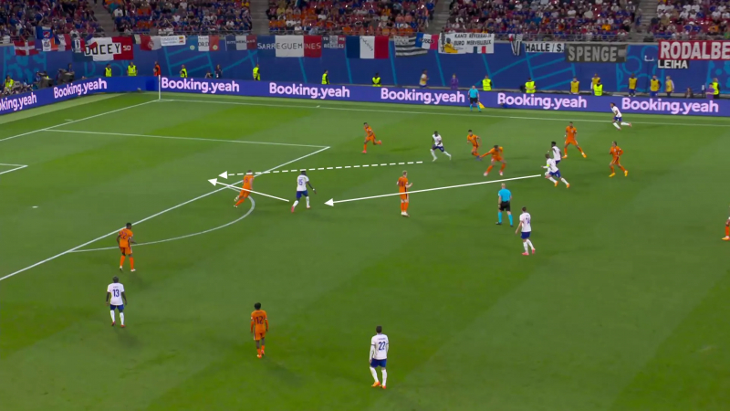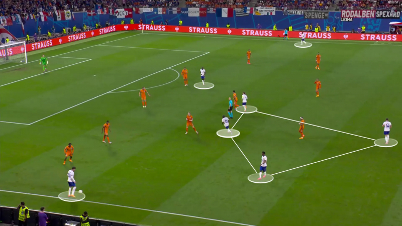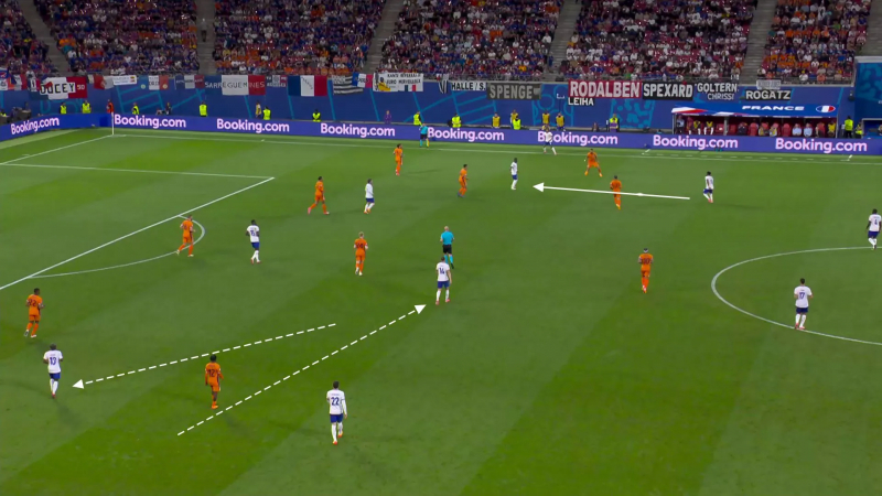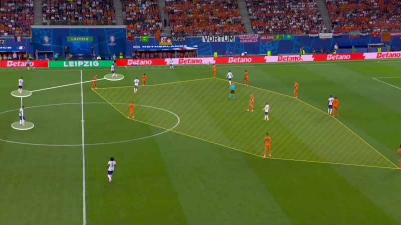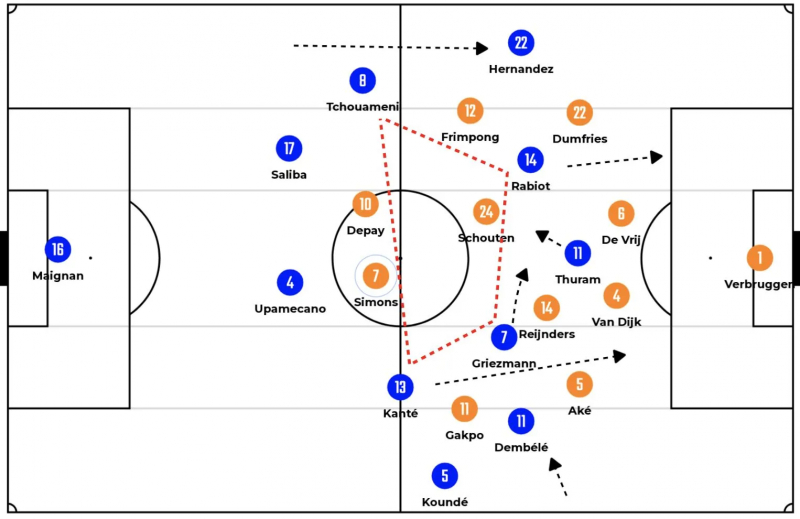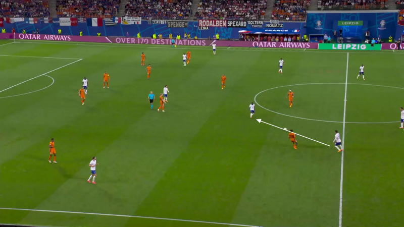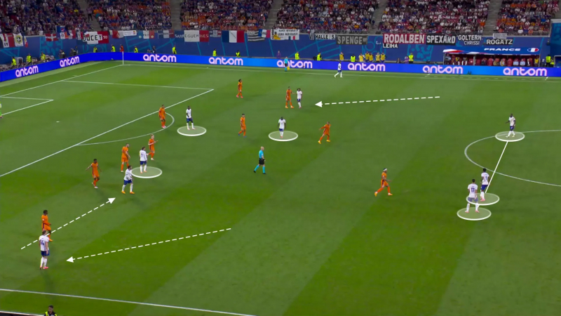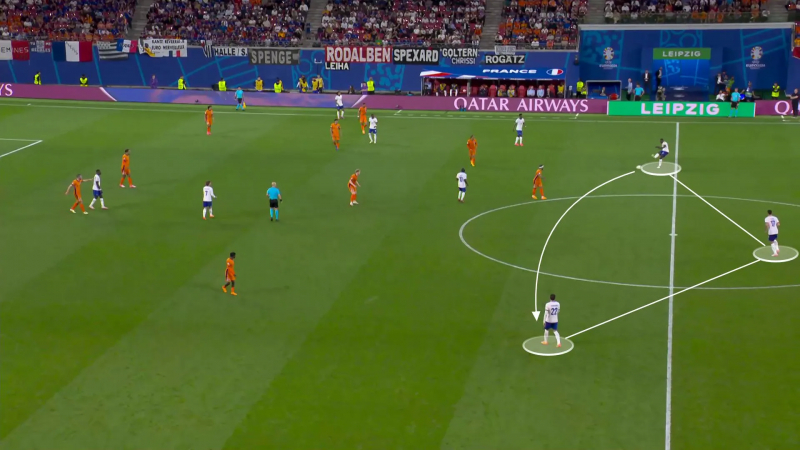 Mais cette structure n’est pas figée : on voit après quelques mouvements, Tchouaméni venir former la défense à trois, Koundé sauter et fixer Gakpo à l’intérieur, Hernandez faire de même avec Dumfries, Rabiot prendre le large, Kanté jouer dans un couloir intérieur au niveau de Griezmann…