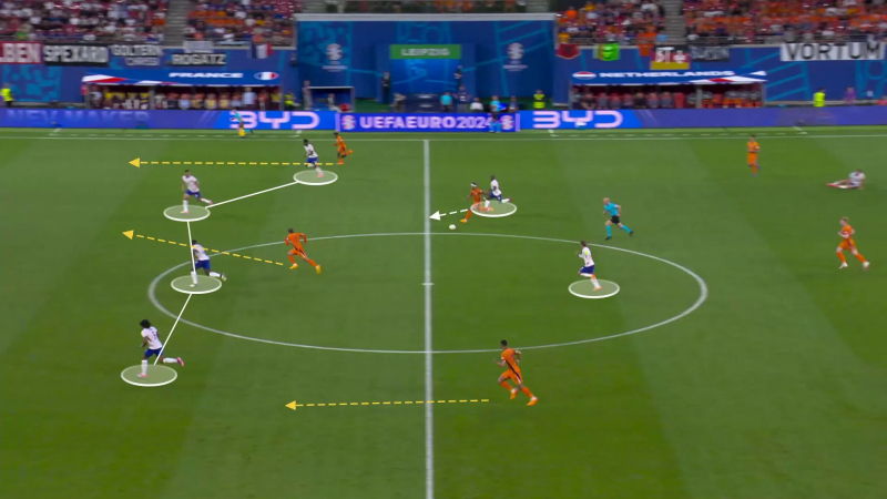 … l’organisation défensive néerlandaise va alors voler en éclats en trois passes via du jeu combiné axial…