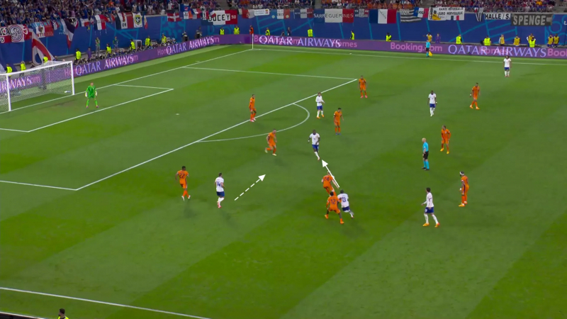 L’expliquer revient dans un premier temps à répéter ce qui avait été noté face à l’Autriche, mais il faut ici ajouter le fait que les Bleus ont beaucoup plus eu le ballon que d’habitude (63% du temps) et qu’ils ont eu le loisir de choisir le rythme de leur match, multipliant alors les passes tout en prenant – et c’est de loin le plus important – le soin de (trop, oui, le jeu aurait dû être beaucoup plus direct sur certaines situations) se structurer face aux éventuelles pertes de balle. Aurélien Tchouaméni, qui a souvent décroché à la gauche de Saliba pour offrir une supériorité numérique à la relance, a dans ce cadre été essentiel pour stopper les transitions offensives bataves, bien aidé, bien sûr, par le duo Rabiot-Kanté.