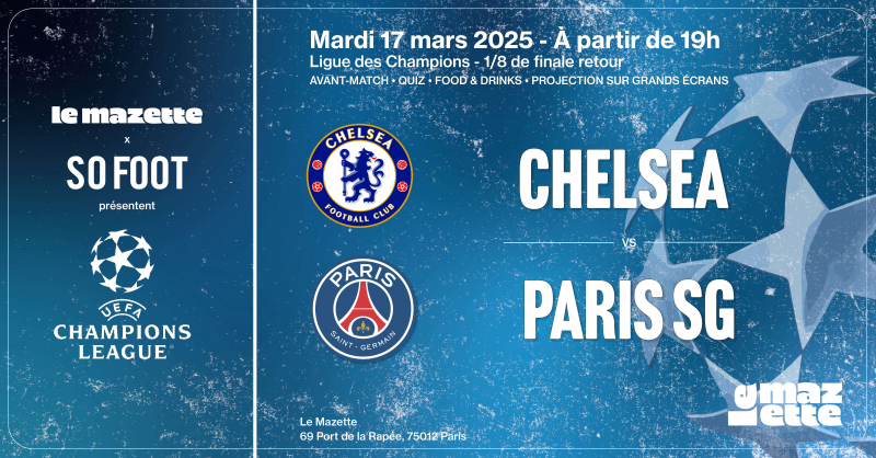 ► 18h : ouverture des portes du Mazette, projection du match Chelsea – PSG 2025 ► 20h : avant-match Chelsea – PSG par la rédaction de So Foot, avec un grand quiz public, chants, surprises et des cadeaux à gagner… ► 20h50 : prise d’antenne et diffusion du match ► 21h45 : charade de la mi-temps. ► 23h : l’avenir nous le dira…