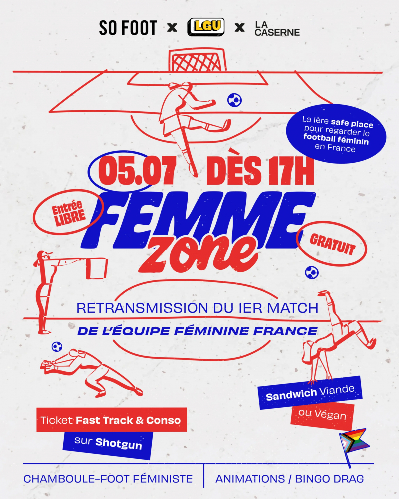 Dès 17h, rejoignez la 1re Femme Zone de France pour une soirée exceptionnelle face aux championnes d’Europe en titre, avec animations, quiz, concours, boissons et sandwichs pour toutes les croyances, et mêmes les athés/ées du foot !