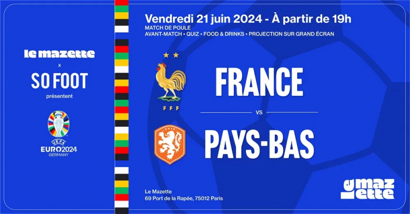 Alors pour ne pas louper de nouveau une soirée So Foot sur la péniche Le Mazette (sur 3 étages) toute proche de la gare de Lyon, prends dès maintenant ta place pour le troisième match de poules face à la Pologne mardi 25 juin à 18h. Toujours sur la Seine, mais bien avec 4 écrans cette fois-ci.