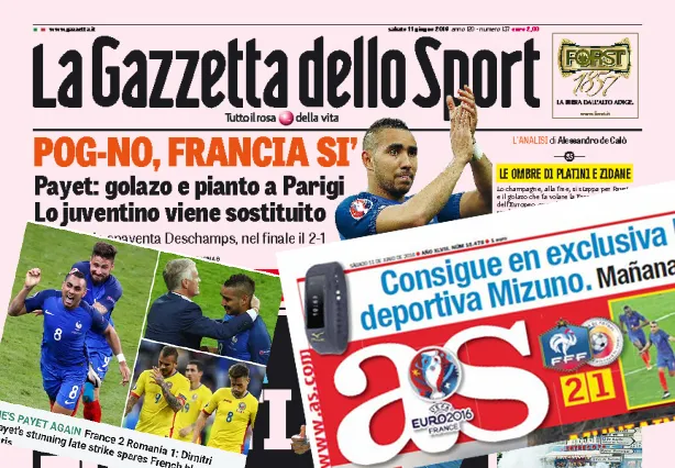 Le quotidien espagnol As titre « Payet sauve l’entrée en lice de la France » . Le journal, séduit comme tout le monde par le match du Hammer, est dithyrambique à son sujet : « Seul un révolutionnaire comme Payet, un dribbleur de colonnes de marbre, a été capable de sauver l’entrée en lice décevante de la France, une équipe qui laisse beaucoup de doutes. » Au contraire des observateurs français, As se montre en revanche plus clément avec Pogba. « On dirait un cygne avec le ballon. Ses mouvements sont fins et mesurés malgré son inégalable puissance et sa corpulence physique. »
