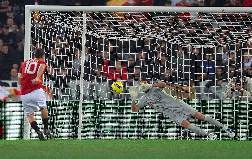 C’est rare, mais il arrive que Totti rate des penaltys. En 2011, lors d’un Roma-Juventus, alors que le score est de 1-1, le Capitaine se fait hypnotiser par son grand pote Gigi Buffon. À noter le commentateur officiel de la Juve, Claudio Zuliani, qui indique à Buffon de plonger à droite. Bien vu.