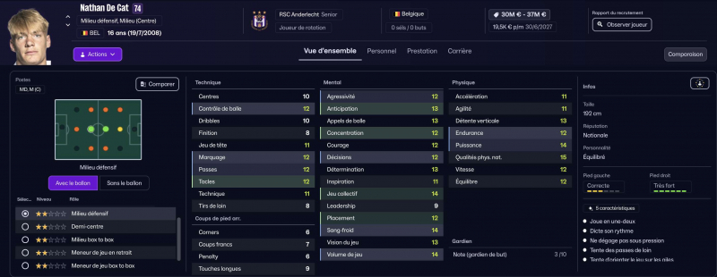C’est le craquage de cette liste. Un crack déjà très cher, mais impossible de ne pas le citer. L’élégance belge en édition limitée. De Cat, c’est la classe flamande : la passe qui casse les lignes et le short bien repassé. Il n’a pas le visage rouge de De Bruyne après 50 minutes, mais il a la même propreté technique. Dans FM, il deviendra ce joueur discret qui fait tout tourner sans jamais râler. 16 ans, sûrement 16 ans de carrière vu la photo, mais vous sentirez sa présence à chaque possession. Le milieu rageux créateur par excellence.