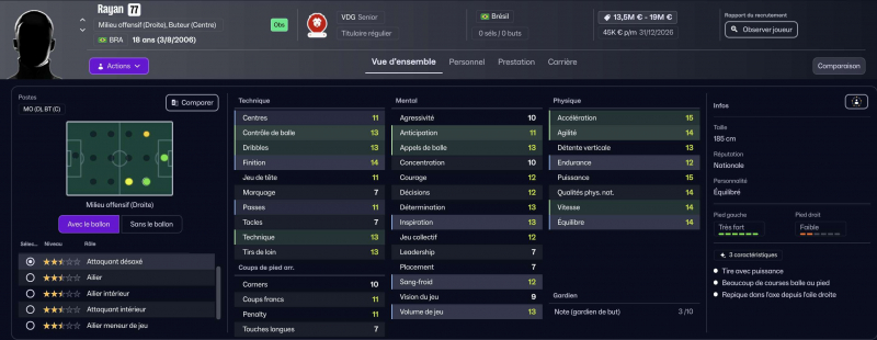 Il est là, notre Brésilien de la liste. Rayan, c’est ce gamin qu’on a vu douze fois dans les compils Wonderkids 2026 sur YouTube. Vitesse supersonique, frappe sèche, zéro repli défensif. Dans FM, il est parfait pour ceux qui aiment la transition à 200 km/h. Vous allez le signer à 18 ans, le titulariser immédiatement, il va tout écraser dans votre championnat et, au bout d’une saison ou deux à tout casser, demandera à partir. Le modèle économique du malheur.