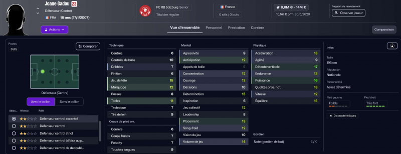 C’est littéralement le cousin numérique d’Oumar Solet. Même gabarit (1,95 mètre), même sérénité, même capacité à claquer des montées balle au pied qui font peur à vos adjoints et, surtout, un défenseur central français qui nous vient d’Autriche, au RB Salzbourg. Gadou, c’est ce défenseur moderne que tout club de Ligue 1 rêve d’avoir : costaud, rapide, parfois un peu trop sûr de lui. Dans FM26, il vous fera vibrer à chaque interception, mais attention : il vous coûtera un carton rouge par saison, histoire de rappeler qu’il n’a que 18 ans.