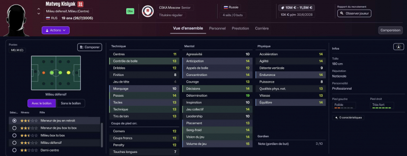 Si vous aimez les registas qui savent aussi tacler, Matvey Kislyak est fait pour vous. La Russie n’exporte plus grand monde, mais FM adore les profils « bunker intelligent » : volume de jeu à 15, anticipation à 14 et détermination à 19. Ce n’est pas un crack TikTok, c’est un mec qui fait le sale boulot, qui récupère, relance et se contente d’une note de 7,3 chaque week-end. Vous ne le verrez jamais dans un highlight YouTube, mais vos expected recoveries vont exploser. Oui, on est bilingues.