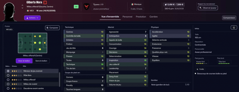 Dans un Mexique qui ne produit plus rien, Gilberto Mora est le nouveau génie absolu de ce FM. Petit par la taille – 1,68 mètre, soit seulement deux centimètres de moins que Lionel Messi –, le minot a encore le temps de grandir. Mora est un amoureux absolu du ballon, tellement que cette année, il jouera trois Coupes du monde. À 16 ans, il affiche déjà la gestuelle d’un Neymar version Santos. Avec 15 en contrôle de balle, 16 en technique et 16 en inspiration, que demander de plus ? Dans FM26, c’est typiquement le genre de joueur qui vous pousse à sacrifier l’équilibre de votre 4-3-3 pour un 4-2-3-1. Comptez 5 millions en plus, sans aucun doute… mais attention au permis de travail !