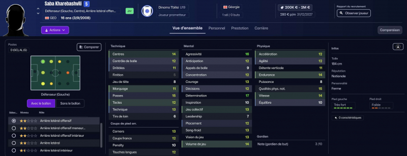 Chaque FM a son latéral gauche exotique qui vous rend fier d’avoir cliqué sur « Afficher les championnats non jouables ». Cette année, il vient de Géorgie, s’appelle Saba Kharebashvili et semble courir comme s’il devait attraper le bus tous les matins. Encore mineur à la sortie du jeu, il faudra patienter avant de le signer, mais soyez sûrs que vos scouts reviendront avec un rapport : « potentiel exceptionnel, aimerait s’adapter à la vie en Europe occidentale ». Traduction : il vaudra 45 millions dans deux saisons.