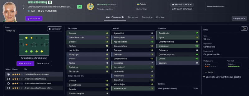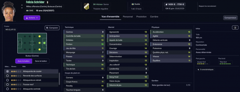 La future reine. Les féminines débarquent cette année sur FM26, et on ne va pas les oublier dans cette liste. Felicia Schröder en sera la figure de proue. Avant-centre suédoise, instinct de tueuse et sang-froid impressionnant à seulement 18 ans, elle incarne parfaitement la nouvelle génération. C’est le genre de profil qui vous rappellera pourquoi vous aimez faire confiance à la jeunesse. Mais Felicia, c’est une numéro 9 moderne : elle sait lâcher le ballon, elle sait dribbler. On tient peut-être là notre prochaine Ballon d’or scandinave après Ada Hegerberg.