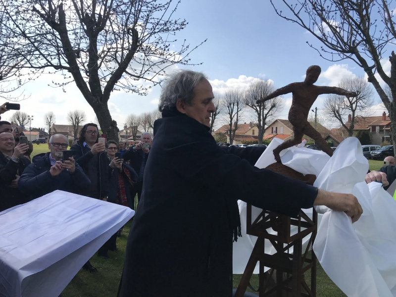 À côté de la statue, sur la place verte où les galibots tapaient leurs premiers ballons, une petite scène a été montée. De nouveaux discours se succèdent : le maire de la commune, Albert Gemmrich, reprend la parole, pas Platini. Au nom du Comité des internationaux de France, le fils de Jean-Pierre Piumi évoque « ce petit village où les grands hommes sont à leur place », « ce romantisme du football qu’on perd de vue » et « le devoir de mémoire nécessaire car, si beau et rutilant soit un arbre, il a besoin de ses racines ». La foule apprécie, Carlo Molinari aussi. L’ancien président messin est passé en ami, et salue tout le monde. Mais il s’éloigne, volontairement, au moment où Michel Platini et Bernard Zénier découpent, en compagnie du maire, le ruban de la nouvelle statue. On y voit un footballeur perché en haut d’un chevalement, sur un casque de mineur. À côté de l’artiste local, Platini glisse un joli compliment : « C’est très beau, c’est vraiment du beau travail. »