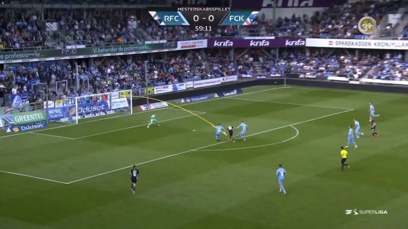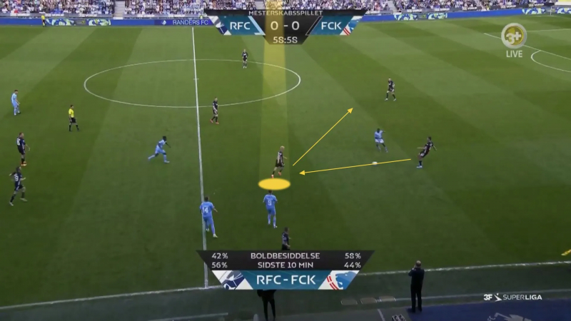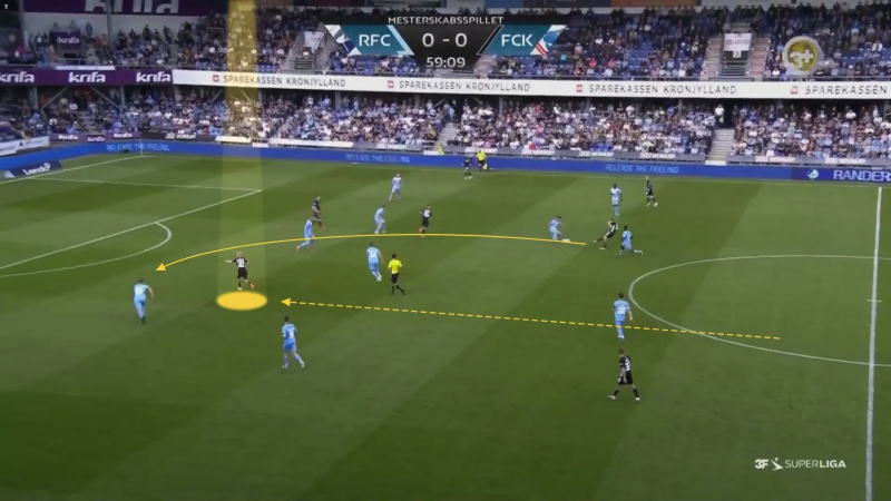 … puis enclencher un appel dans l’espace ouvert par le déplacement d’un coéquipier avant d’être touché en profondeur par Rasmus Falk…