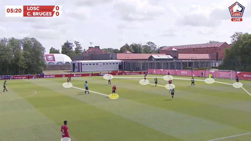 Le 1-4-2-2-2 du LOSC qui, à la sortie de balle, s’est organisé ainsi avec Haraldsson (point jaune) positionné sur la même ligne que Cabella, juste devant un duo André-Baleba, alors qu’Ounas et David (en bas à gauche) écartent au maximum.