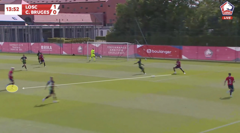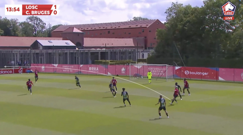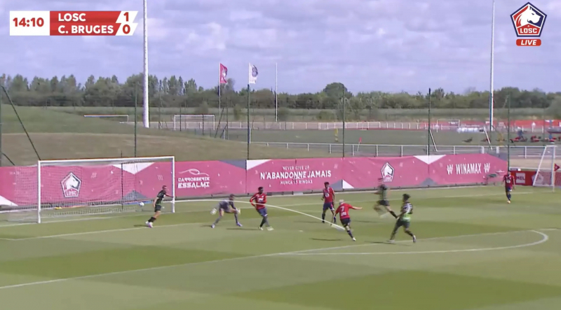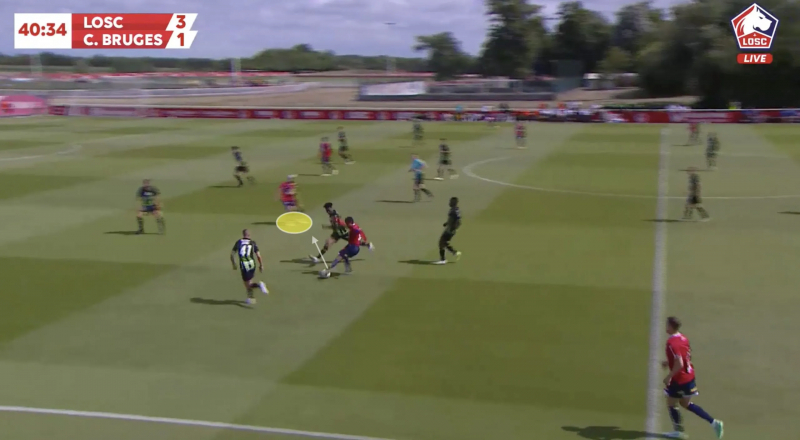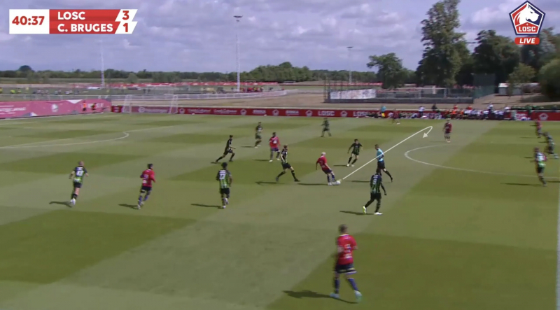 Cette organisation permet de varier les sorties de balle, et Haraldsson a alors été trouvé dans différentes situations, comme ici, au départ du 2-0 face à Bruges, par Aleksandro…